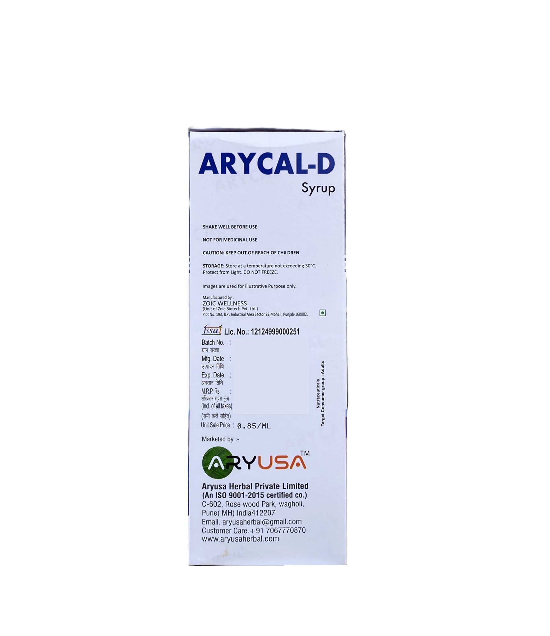 ARYUSA ARYCAL-D is a premium sugar-free nutritional syrup formulated to support strong bones, healthy teeth and active muscle function. It blends Calcium, Vitamin D3, Magnesium and Zinc to improve calcium absorption, boost bone mineral density and enhance overall growth and immunity.