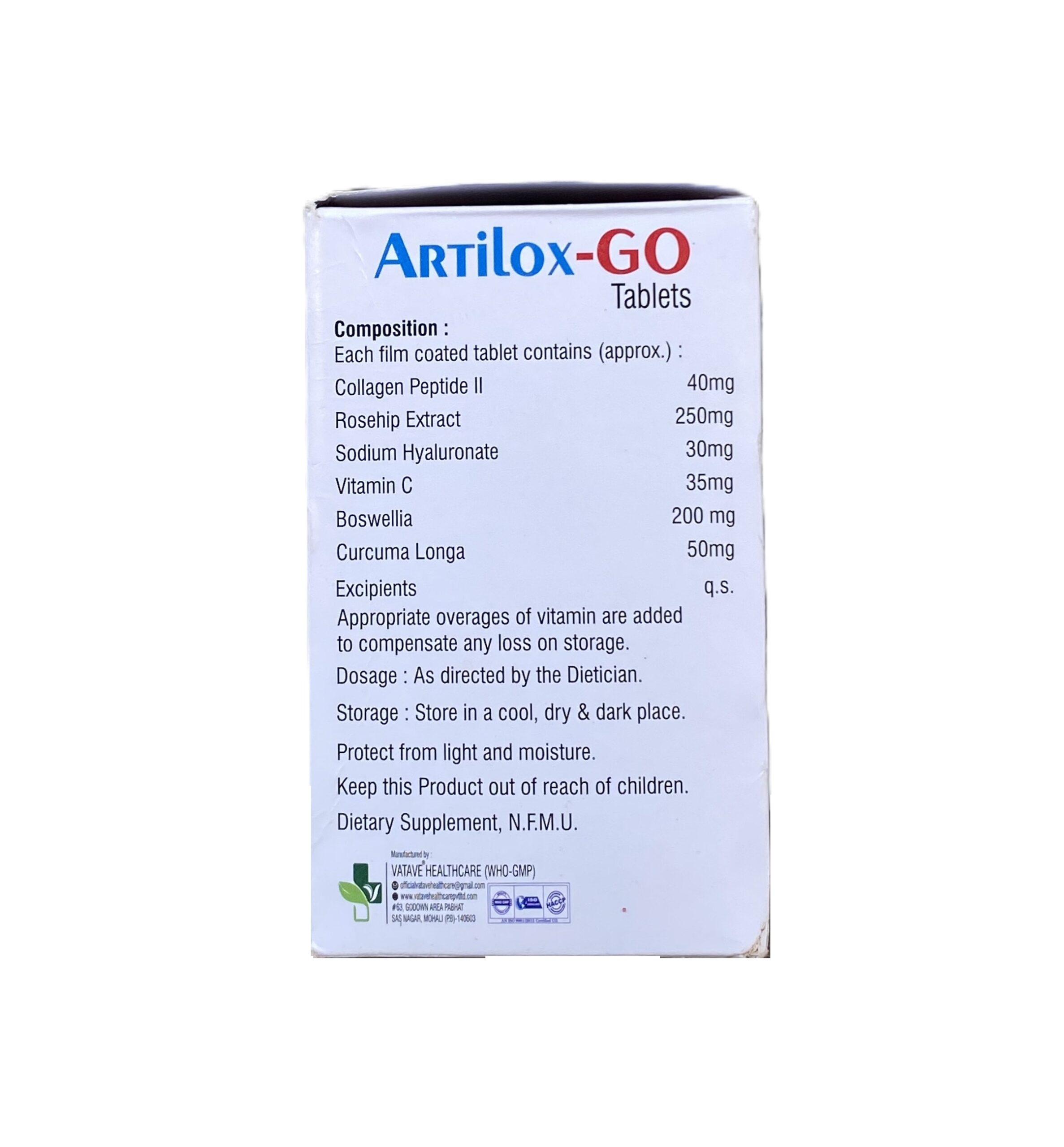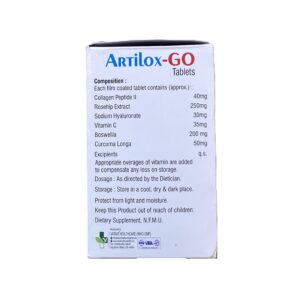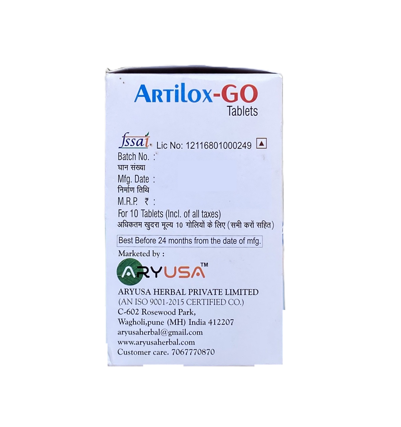 ARYUSA Artilox-GO is a premium joint support formula crafted to keep you flexible, active, and comfortable in motion. Powered by Collagen Peptide Type II, Rosehip Extract, Boswellia and Curcuma Longa, it helps reduce joint stiffness, enhances cartilage health, and supports mobility.