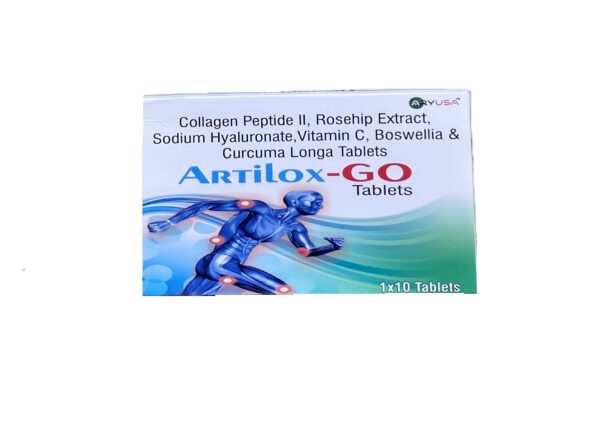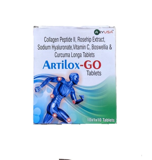 ARYUSA Artilox-GO is a premium joint support formula crafted to keep you flexible, active, and comfortable in motion. Powered by Collagen Peptide Type II, Rosehip Extract, Boswellia and Curcuma Longa, it helps reduce joint stiffness, enhances cartilage health, and supports mobility.